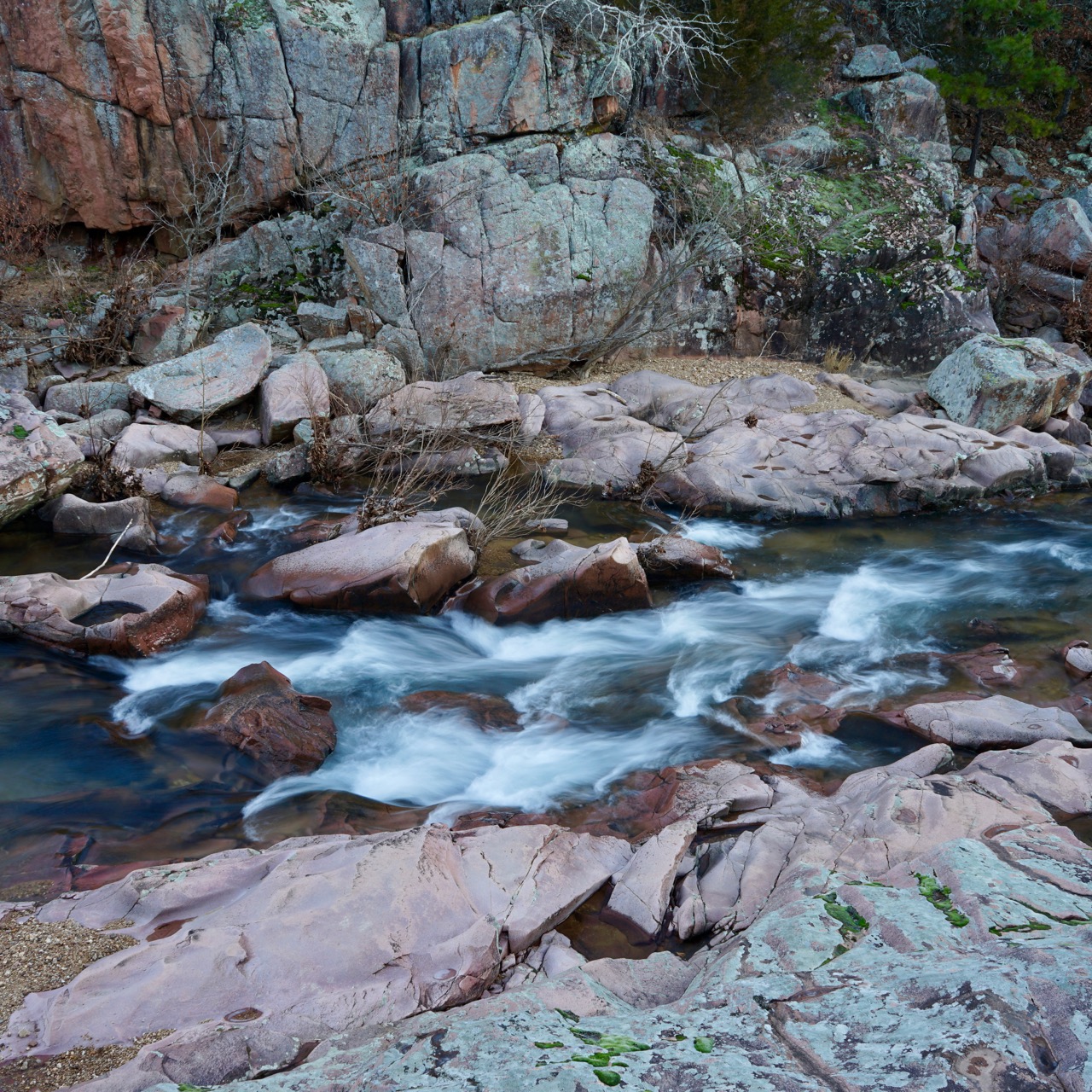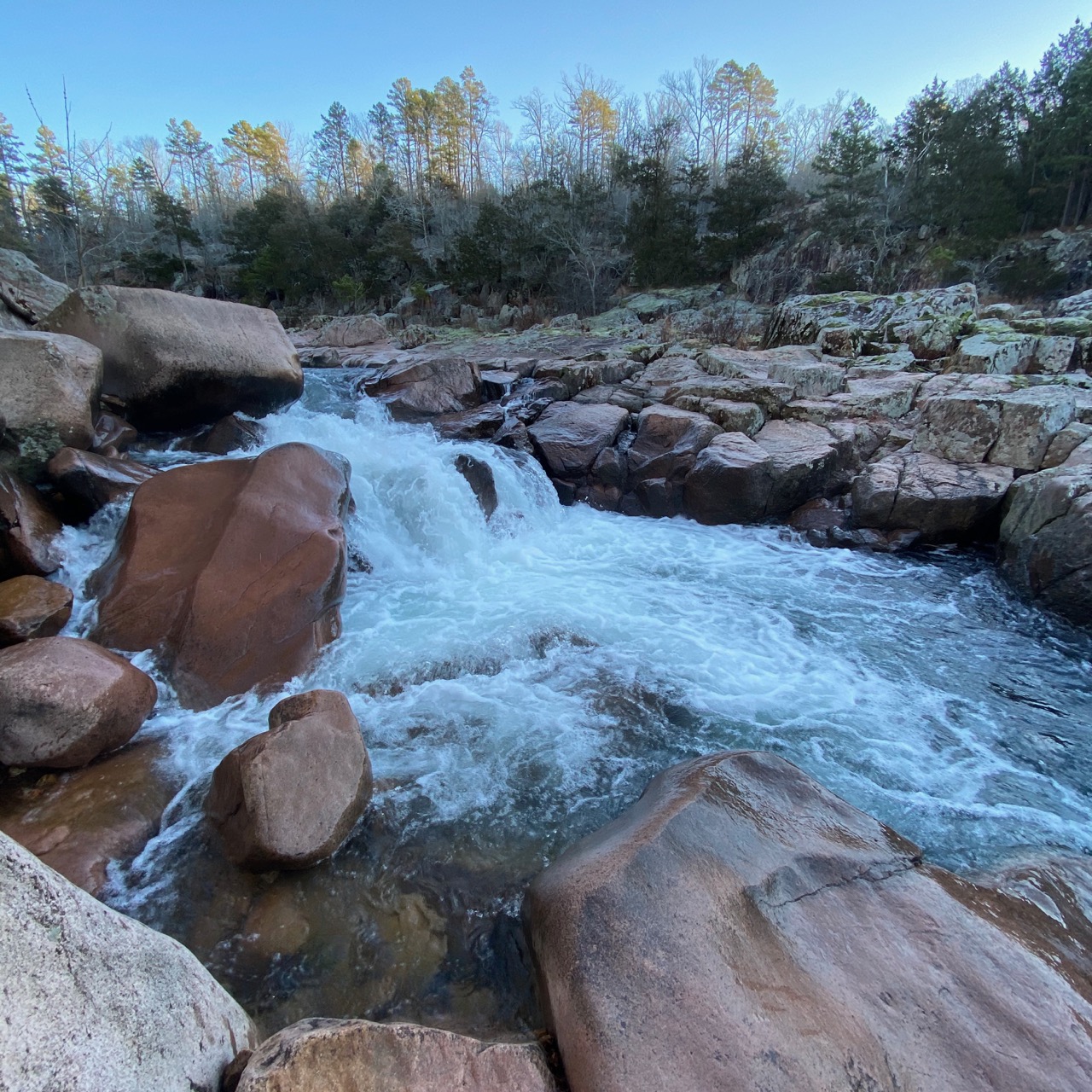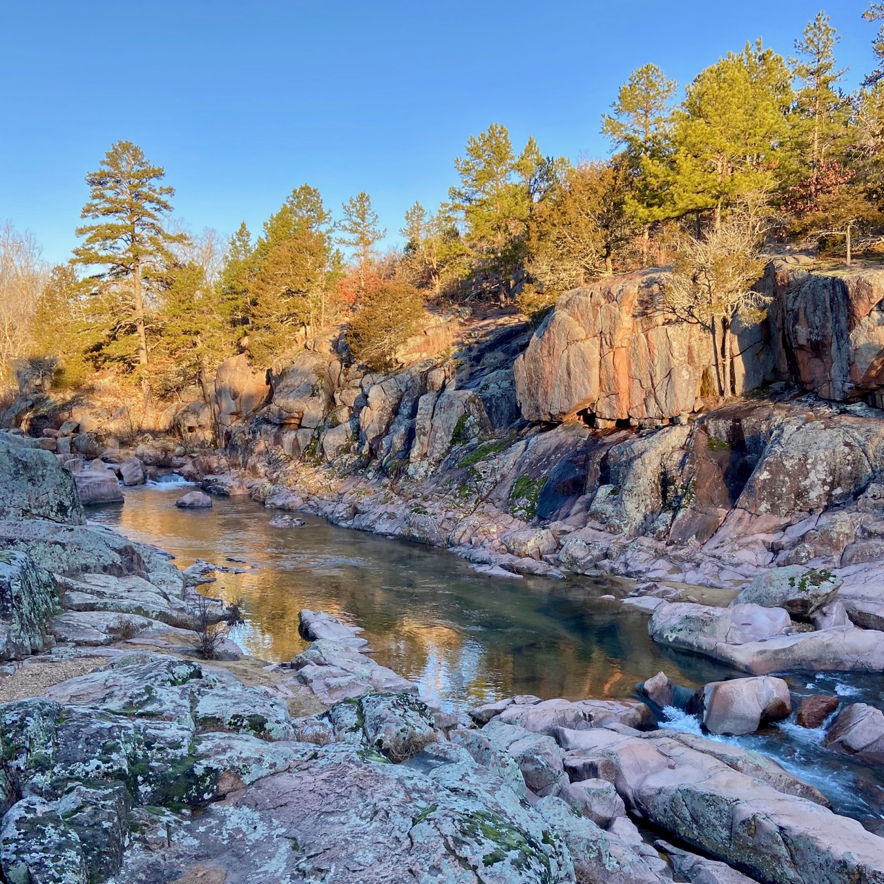 Castor River Shut-ins is an impressive formation with a unique pink-ish color. While other shut-ins may cast red hues, the vibrant pink rhyolite here is absolutely striking. Before recognizing the native glade plant life, one might mistake photos of this area as being from another state.