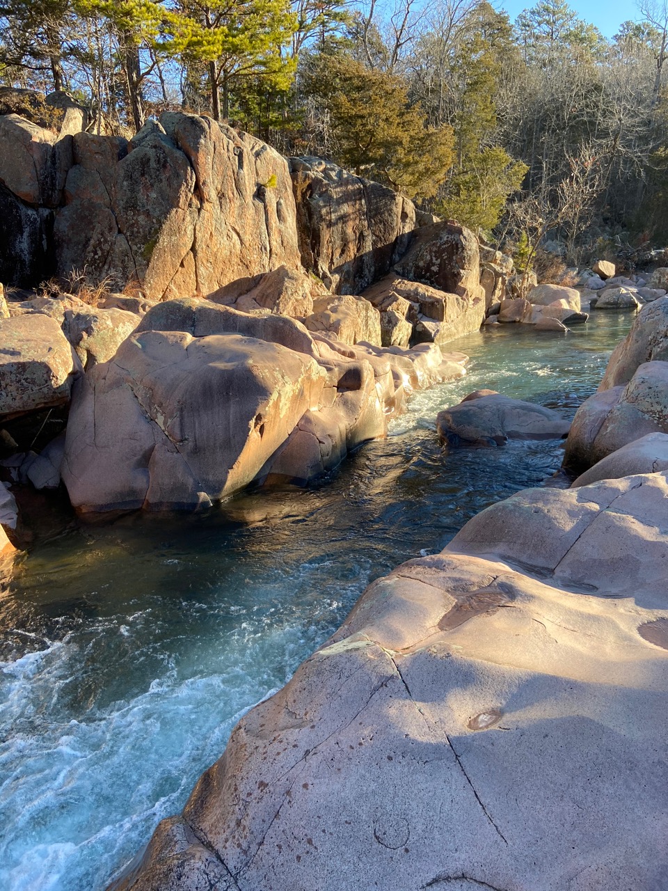 Opening widely in the forest and nearly a quarter mile long, everything about this shut-in feels grand. Giant boulders the size of Volkswagens are strewn about its course. Rising up in sheer pink granite, the walls of its northern bank form a stunning backdrop to the numerous riffles and cascades.